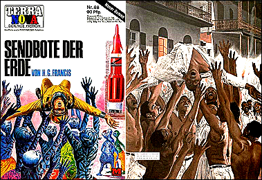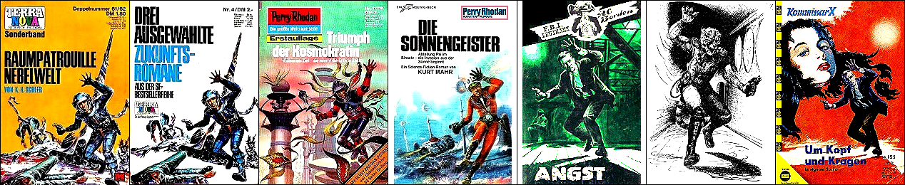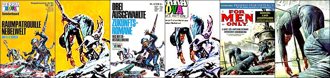 sehr ähnliche Körperhaltung, 1 - 2 gleiches Bild mit verändertem Hintergrund, 5 Vorbild für Nachzeich-nungen, 6 seitenverkehrt, wobei der Mann in einen Außerirdischen verwandelt ist