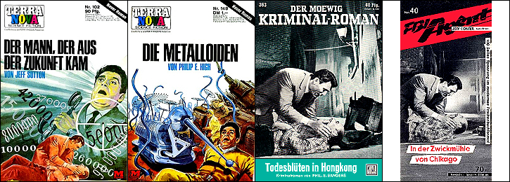 Gesicht des Mannes nachgezeichnet, restliches Bild unterschiedlich; Gruppe im Vordergrund vom Filmfoto nachgezeichnet, das für 3 bzw. 4 verwendet wurde. Der Mann, der sich hinunterbückt, ist Jack Palance in einer Szene aus dem Film "Der Mann ohne Nerven".