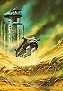 Raumboot über Felslandschaft, dahinter fremdartiger Turm