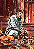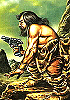 bärtiger Primitiver im Pelz schießt mit Strahlenpistole