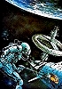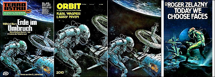 Raumfahrer im Weltraum schießt auf Raumboot, im Hintergrund Raumstation und Erde, - siehe auch Terra Astra Heft Nr. 390