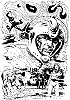zwei Raumfahrer vor ihrem Raketenraumschiff, darüber die Gesichter zweier fast identischer bärtiger Männer