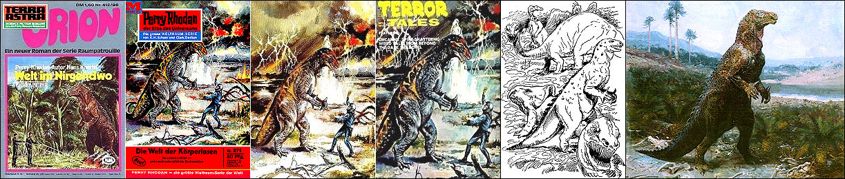 ähnliches Motiv, seitenverkehrt, 2 - 4 gleiches Bild, 6 könnte als Vorbild für den Saurier gedient haben