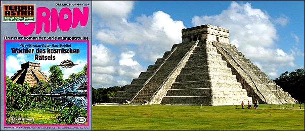 Raumschiffe vor Stufenpyramide im Dschungel, siehe auch PR Heft Nr. 60