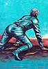 kniender Mann mit aufgestützten Armen beobachtet Raumschiff