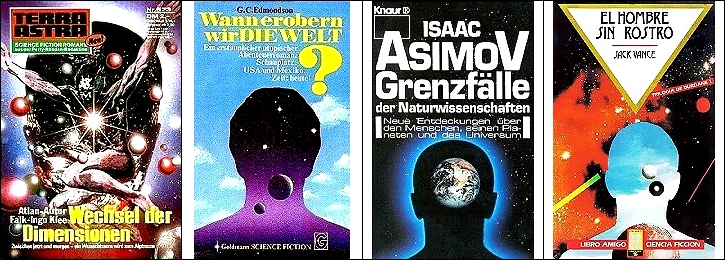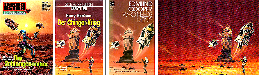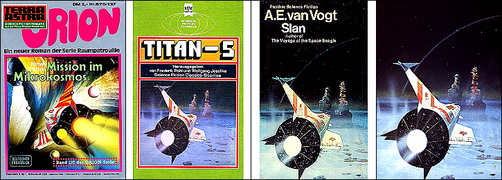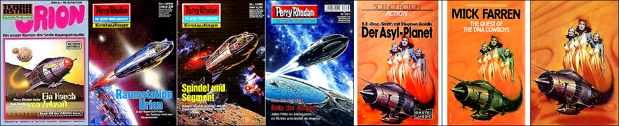 ähnliche Motive und Perspektive, das Raumschiff in 1 ist von 5 seitenverkehrt mit verändertem Bug nachgezeichnet, sogar der Abgasschweif ist gleich vorhanden, 5 - 7 gleiches Bild