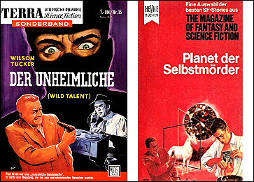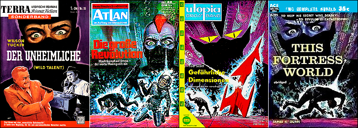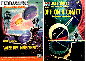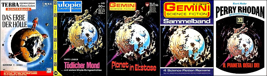 1 - 3 sind von 4 inspiriert bzw. nachgezeichnet. Der Mann mit den stechenden Augen ist in 3 zwar nur stilisiert abgebildet, aber die im Energiefeld fallenden Menschen und der Boden sowie der farbliche Hintergrund sind ganz klar nach dem Originalbild gemalt. Eine wohl einmalige Geschichte, dass sich mit Stephan, Bruck und Lonati die bekanntesten deutschen SF-Zeichner der sechziger Jahre bei einer ihrer Titelbildgrafiken beim gleichen Vorbild bedienten.