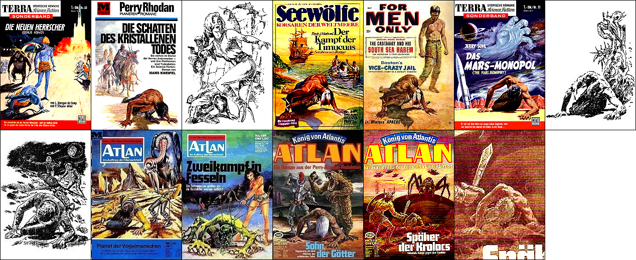 1 - 2, 4 - 7 gleiches Bild, Vorbild für Nachzeichnungen, wobei der Mann in 1 und 3 in einen Raumfahrer verwandelt wurde |