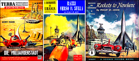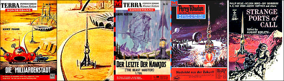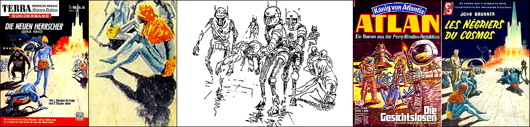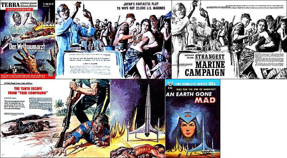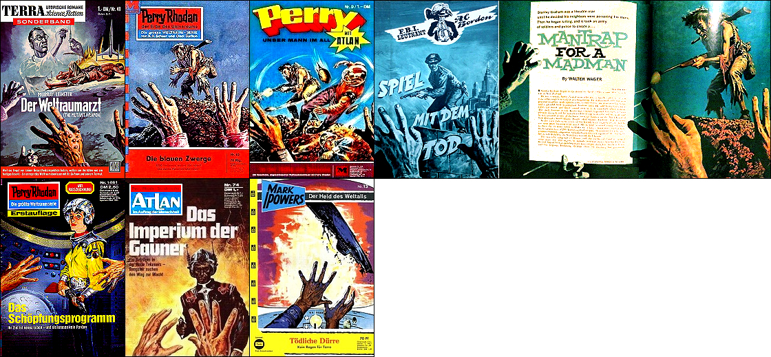 der Arzt ist von 2 bzw. 3 nachgezeichnet und die liegenden Menschen von 4, 2 - 3 gleiches Bild, das Raketenraumschiff im Hintergrund hat das Vorbild in 6 |