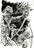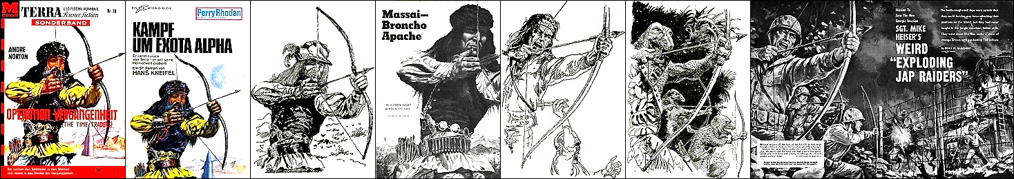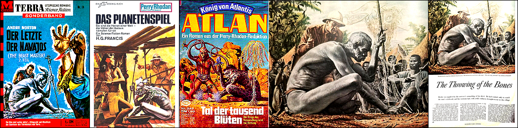 der Eingeborene ist in Bild 1 und 2 fast identisch, in 2 seitenverkehrt, aber in 1 hat er in Gehörn und in 2 einen Federbusch auf dem Kopf, restliches Bild unterschiedlich, in Bild 3 ist der Mann etwas anders gezeichnet, hat aber exakt die gleiche Körperhaltung, 4 ist Vorbild für Nachzeichnung |