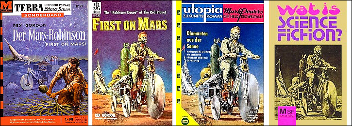 Mann mit Sauerstoffmaske auf fremdem Planeten, daneben Spezialfahrrad |