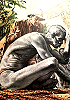 Eingeborener mit Stab in der Hand sitzt vornübergebeugt |