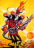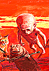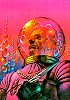 Mutant mit großem Kopf umringt von Tieren mit Waffen