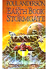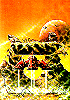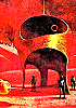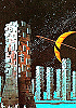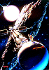 Raumboot vor trapezartigem Felsfenster und Mond im Hintergrund |