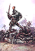 Statue von Kämpfer mit Helm und geschultertem Speer auf Sockel |