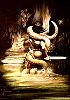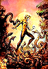 nackter Mann mit Kristallkugel wird von Schlangen bedroht