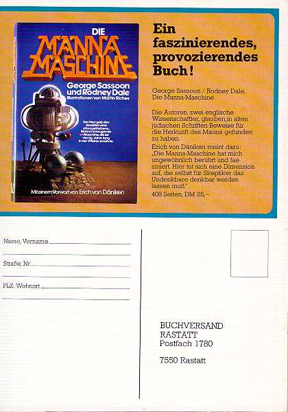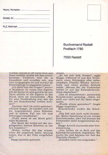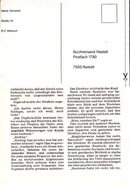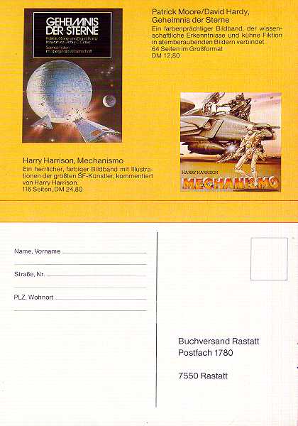 Karton-Papier gedruckte Beilage in Farbe. Werbung für SF-Bücher des Buchversand Rastatt. |