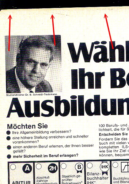 Der obere Rand dieses Heftes ist schräg geschnitten. Dies geschieht, wenn die Schneide-Maschine nicht genau eingestellt