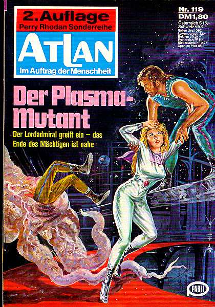 "Der Plasma-Mutant" von Kurt Mahr Die untere Heftklammer ist nach rechts verschoben. Dieser kleine Konfektionierungs-Fehler tritt meist durch eine ungenaue Justierung der entsprechenden Heft-Maschine auf.
