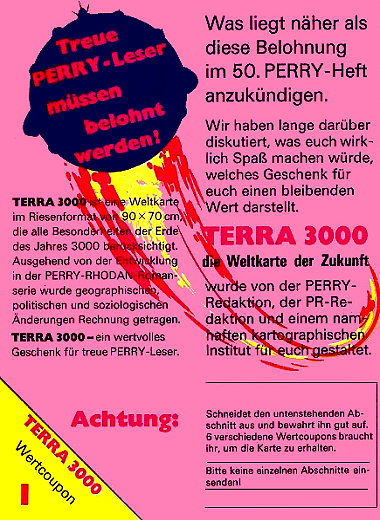 für den Jubiläumsband 50 etwas Neues aus, das auf der Titel- und Rückseite des Heftes angekündigt wurde: eine Weltkarte Terra 3000 im