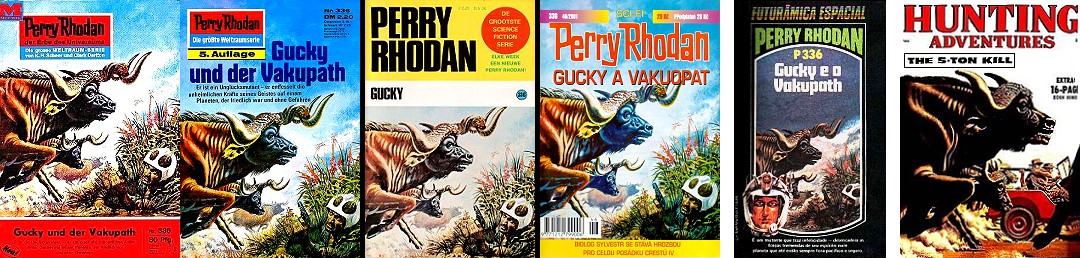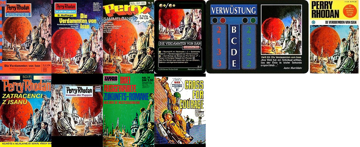 1 - 5 gleiches Bild, 5 seitenverkehrt, 6 und 7 Motivübernahme für japanische Ausgaben, 8 ähnliches Motiv |