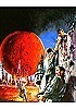 Männer machen Räuberleiter über Mauer vor rotem Mond |