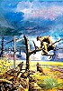 Soldat mit Stahlhelm und Zigarette, der zurück blickt, daneben bombenförmiges Gerät mit Außerirdischem, Soldatengruppe und Panzer |