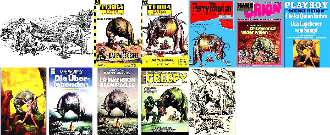 ähnliches Motiv, 3 und 4 gleiches Bild, seitenverkehrt mit überarbeitetem Hintergrund, 6 - 7, 8 - 9 gleiches Bild, 11 Saurier mit Schnabel ergänzt, sonst gleiche Körperhaltung |