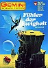 Raumfahrer mit Handfunkgerät, dahinter gespenstartiges Wesen |
