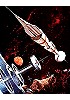 Raumboot über Mondlandschaft mit gelber Sonne im Hintergrund |