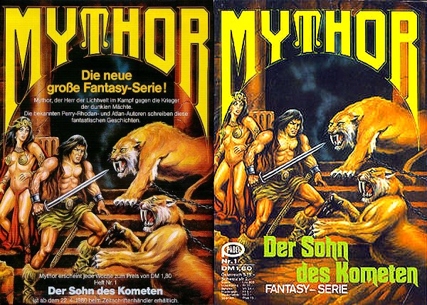Mythor mit Schwert verteidigt Prinzessin gegen Säbelzahntiger |