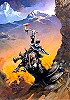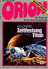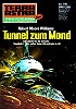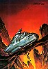 Raumboot vor trapezartigem Felsfenster und Mond im Hintergrund |