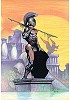 Statue von Kämpfer mit Helm und geschultertem Speer auf Sockel |