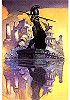 Eingeborener mit Speer schaut von Felsvorsprung auf gelandetes Raumschiff |