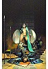 im Folterstuhl sitzender gefesselter Mensch mit Eisenkragen um den Hals und Elektroden am Körper |