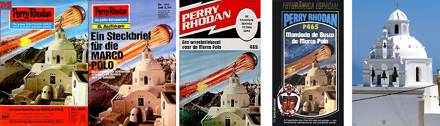 1 - 4 gleiches Bild, die Kirche Agios Minos in Thera (Santorin) wurde mit Waffentürmen und Sendemast auf der Kuppel ergänzt und ins Bild eingebaut |