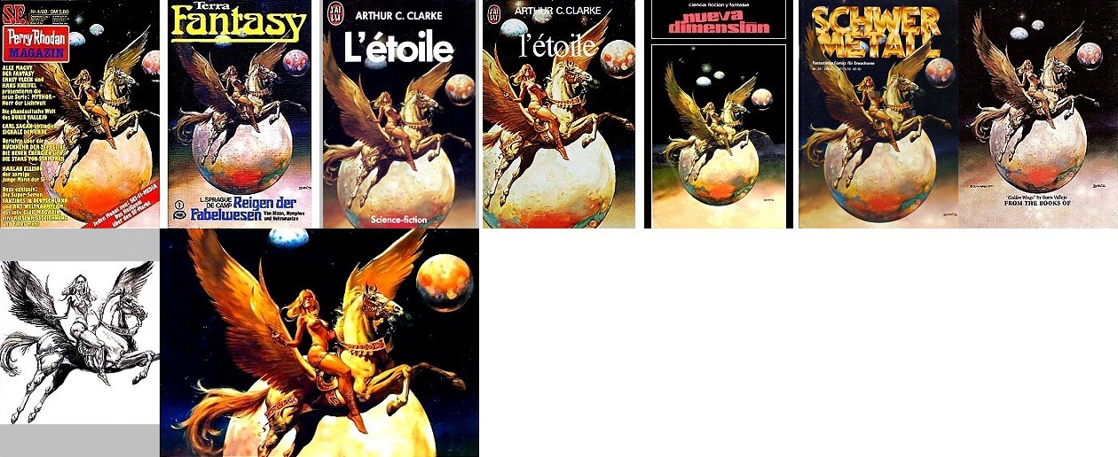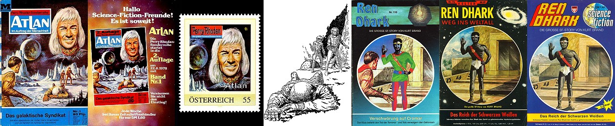 1 und 2 gleiches Bild, 3 Ausschnitt Atlan-Kopf, 4 liegender und hintere Raumfahrer als Federzeichnung, 5 vorderer Raumfahrer aus 1 als Collage eingebaut, 6 Vorlage für 5 |