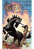 Drachenreiter auf Felsen, darunter Krieger mit Schwert |
