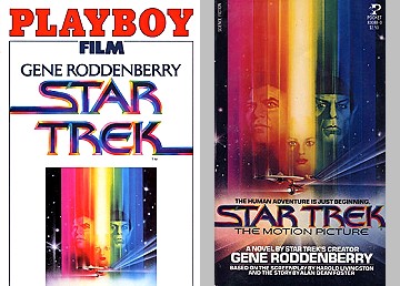 Kirk, Spock und Ilia mit Enterprise im regenbogenfarbigen Streifen |
