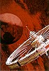 radförmige Raumstation über Erde vor rotem Hintergrund |