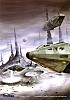 Walzenraumschiff über Stadt, davor Kegelroboter |