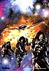 Raumsoldaten in schweren Schutzanzügen vor Explosion |
