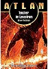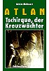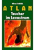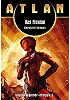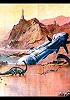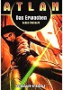 Mann/Frau steht vor Säule und bedroht/schaut entsetzt auf rotfarbigen Außerirdischen |