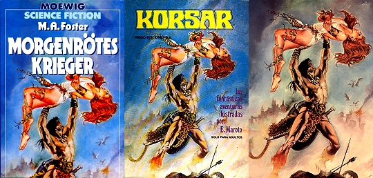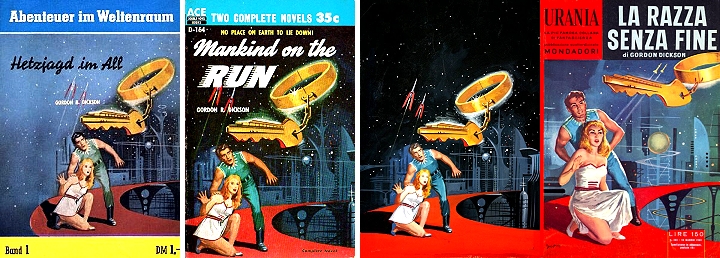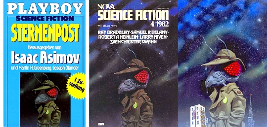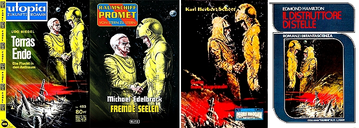 1 - 3 gleiches Bild, 1 leicht nachbearbeitet (Schatten links), 4 für italienische Ausgabe des gleichen Romans nachgezeichnet |