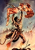 muskulöser Krieger stemmt rothaariges Mädchen über dem Kopf |