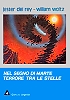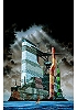 Raumboot vor schwarzem Gebäude auf Felssporn, dahinter roter Himmel und Mond |