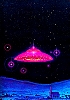 Raumschiff vor roter Sonne strahlt breiten Lichtstrahl Richtung Boden |