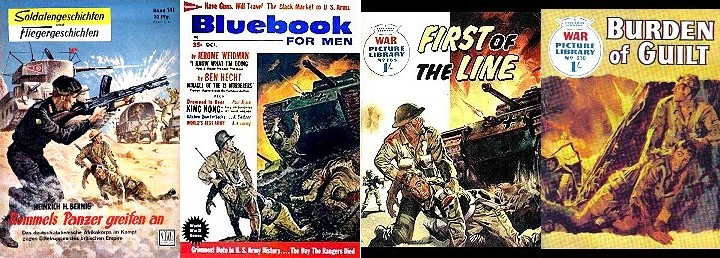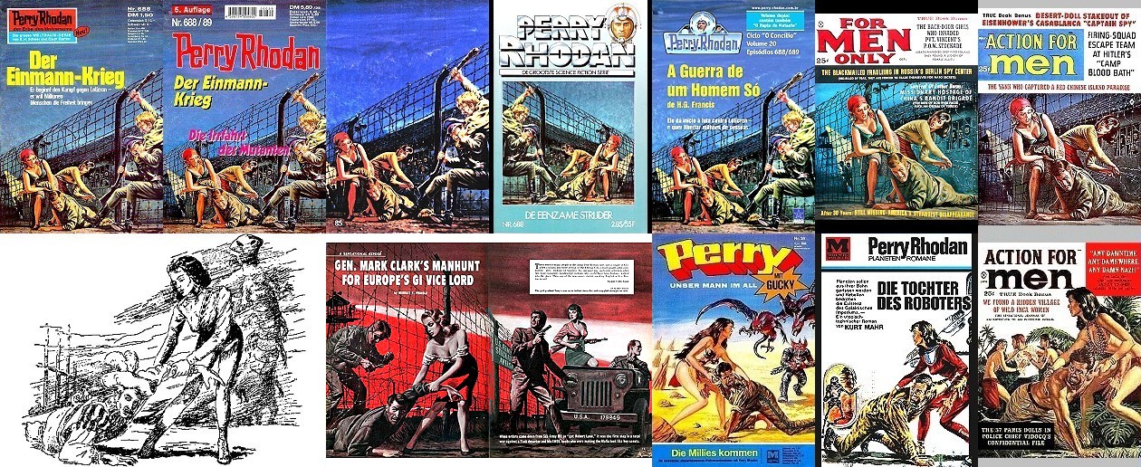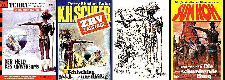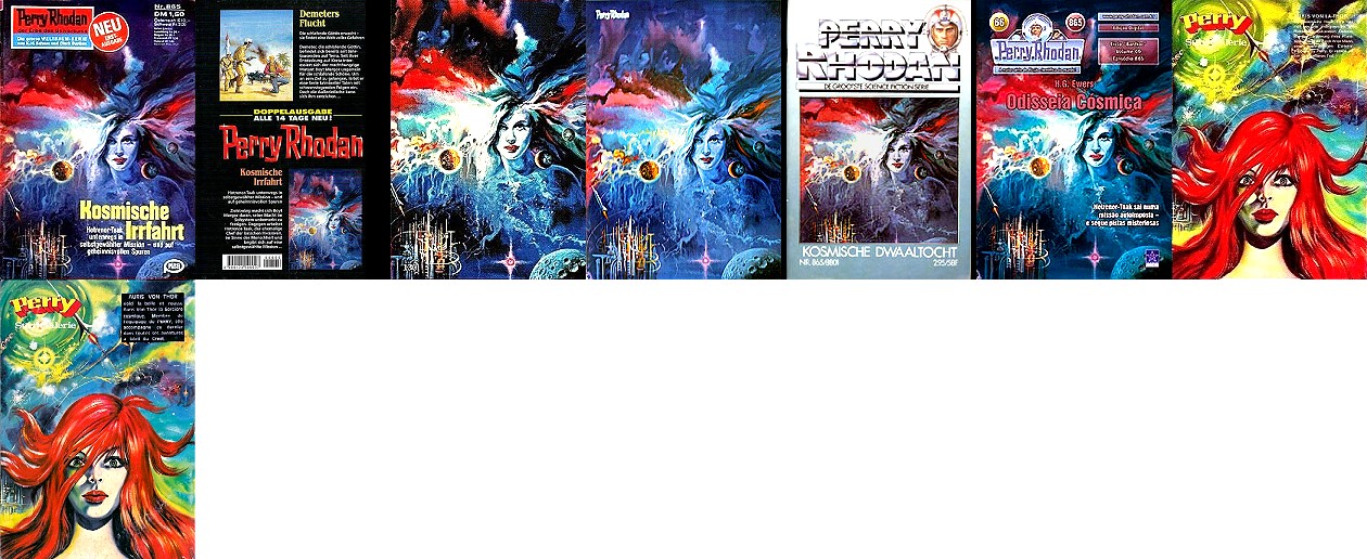 ähnliches Motiv, 1 - 6 gleiches Bild, 6 leicht nachbearbeitet (Hintergrund oben schwarz), 7 Nachzeichnung von 1 für HC-Ausgabe, 9 Nachempfindung von 8 für Neuauflage |