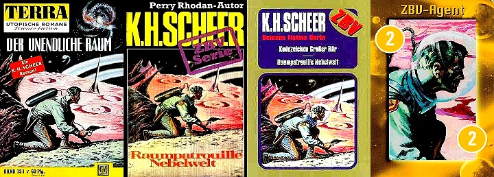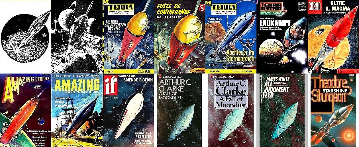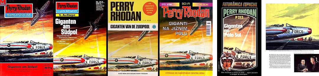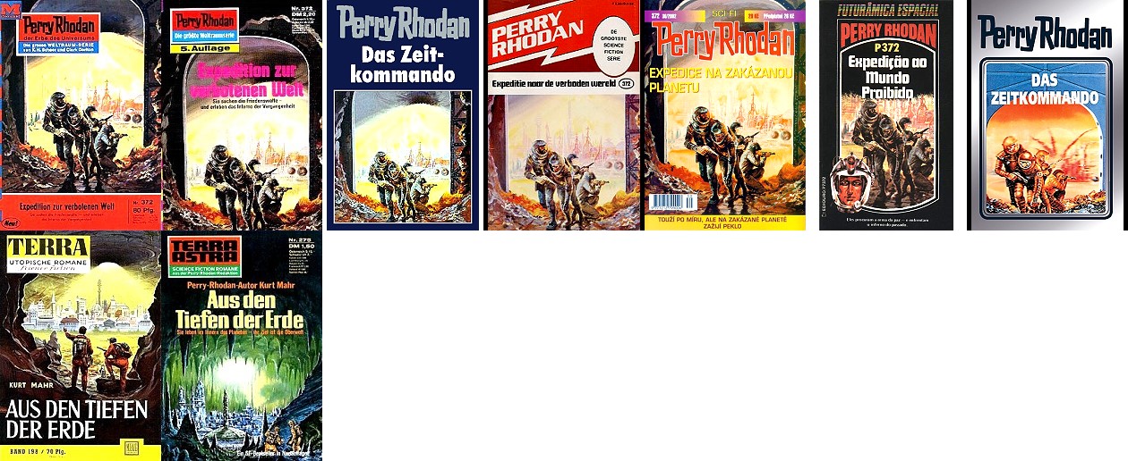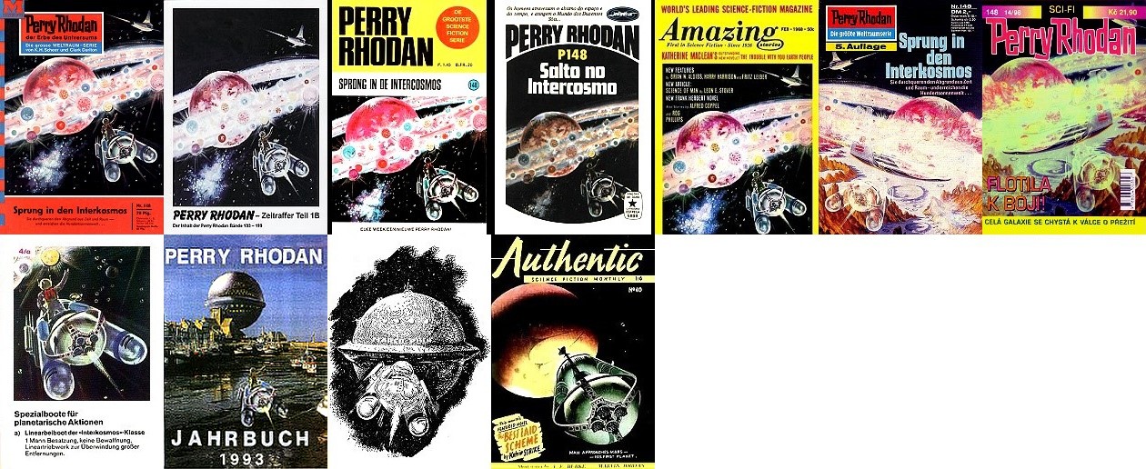 1 - 8 gleiches Bild, 6 und 7 für Neuauflage untere Bildhälfte überarbeitet, 6 seitenverkehrt, 8 Ausschnitt mit Raumboot, 9 Raumboot als Collage eingebaut, 10 ähnliches Raumboot, 11 Vorbild für Raumboot-Nachzeichnung |