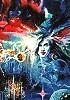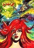 Frauenkopf mit wehendem Haar vor farbenprächtigem Hintergrund |